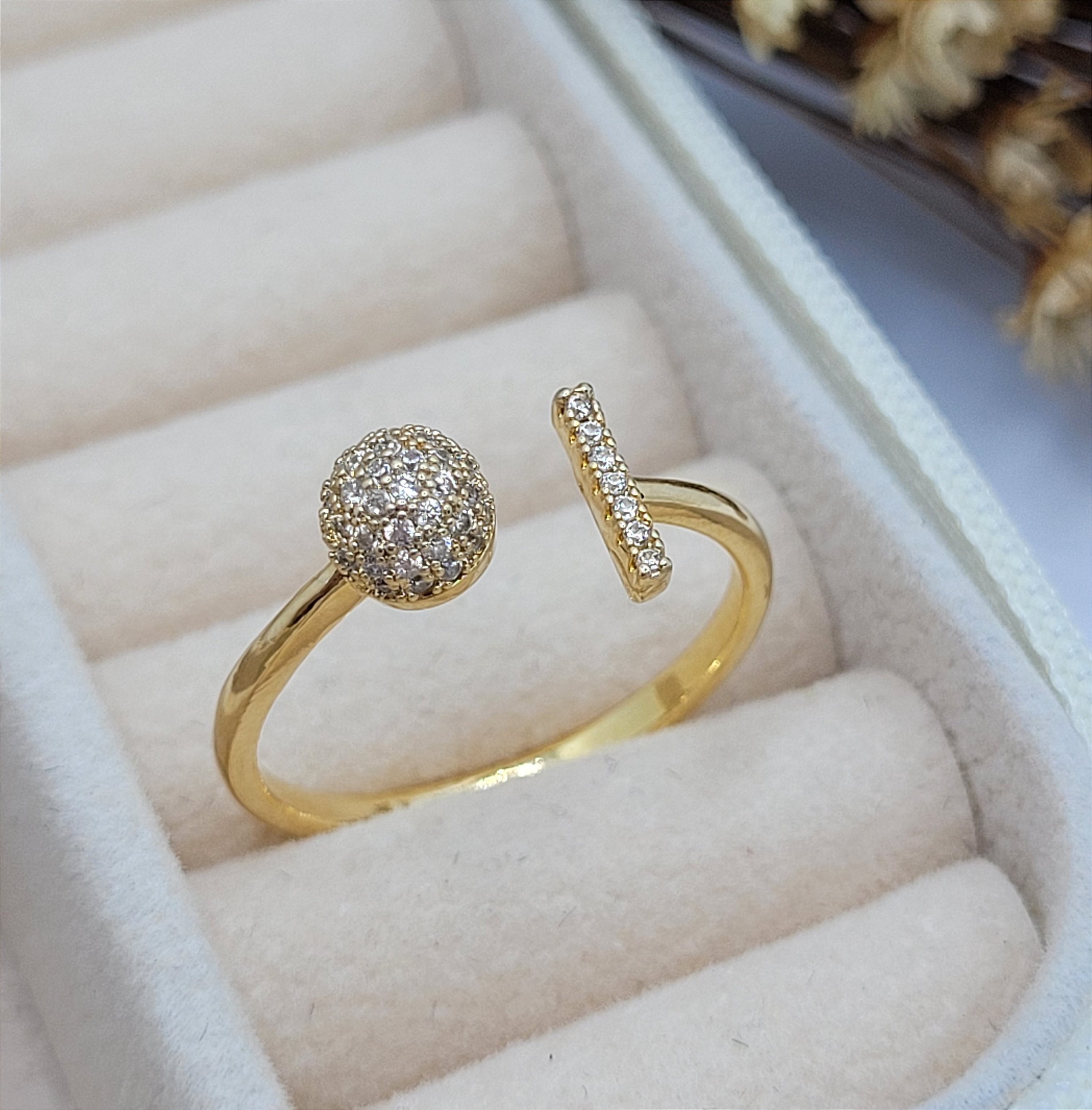 Anel ajustável com bola cravejada de microzirconias. Variação entre os números 22 e 26.