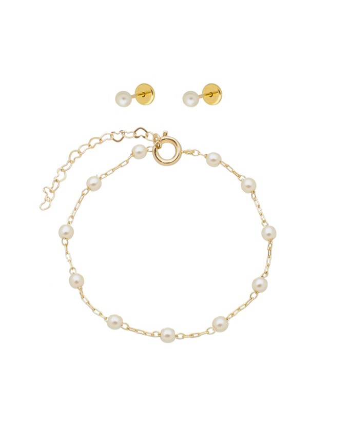Conjunto infantil com pulseira de pérolas e brinco de pérolas com tarraxa baby.